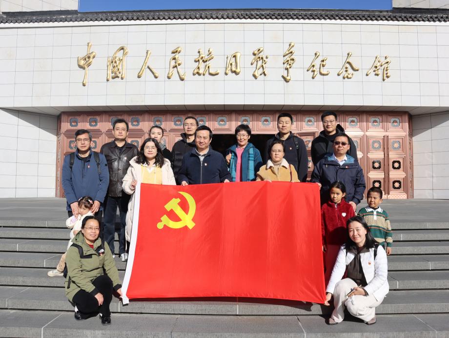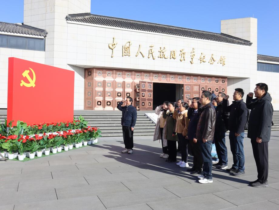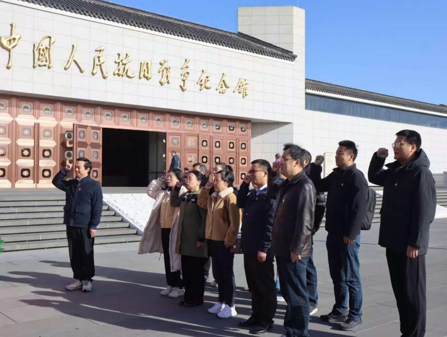 上午,老师们集体乘车抵达宛平城。在庄严肃穆的中国人民抗日战争纪念馆门前,贺大兴老师带领大家整齐列队,面向鲜红的党旗举起右拳,集体重温入党誓词。