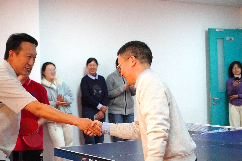 随后,学院第一届教职工乒乓球赛冠军党建所与嘉宾团队之间进行表演赛。比赛过程精彩纷呈,选手们攻防转换迅速、配合默契,展现出高超的竞技水平与饱满的精神状态。赛场上气氛热烈,掌声与喝彩声此起彼伏,充分体现了“友谊第一,比赛第二”的体育精神。