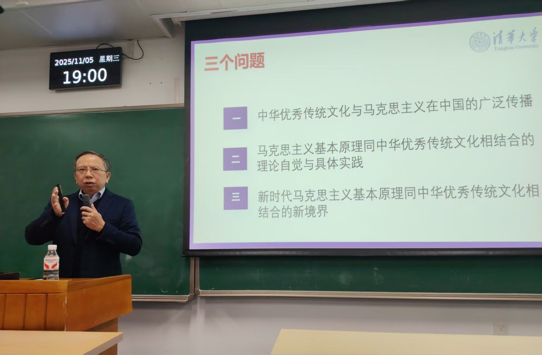 2025年11月5日晚,在北京大学第三教学楼503教室,清华大学马克思主义学院欧阳军喜教授应邀作“历史视野下的马克思主义基本原理同中华优秀传统文化相结合”专题讲座。讲座由北京大学马克思主义学院林绪武教授主持,学院硕士、博士研究生共80余人参加。